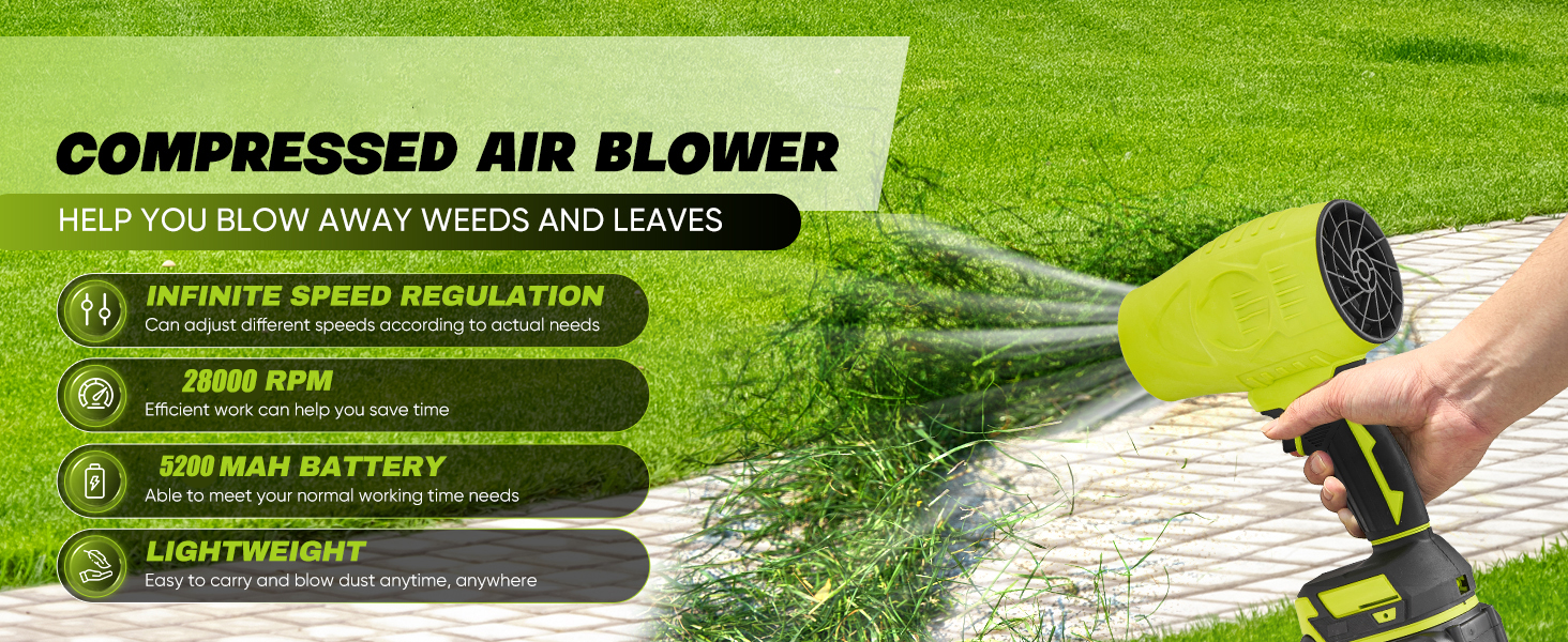 Advanced Motor: Cordless Leaf Blower adopts advanced turbo technology to maximize airflow output. Up to 28000RPM, the portable dust cleaner boasts a blowing power of 600G. This enables you to tackle tasks quickly and efficiently. It easily clears outdoor debris like fallen leaves and even snow, saving you time and effort.