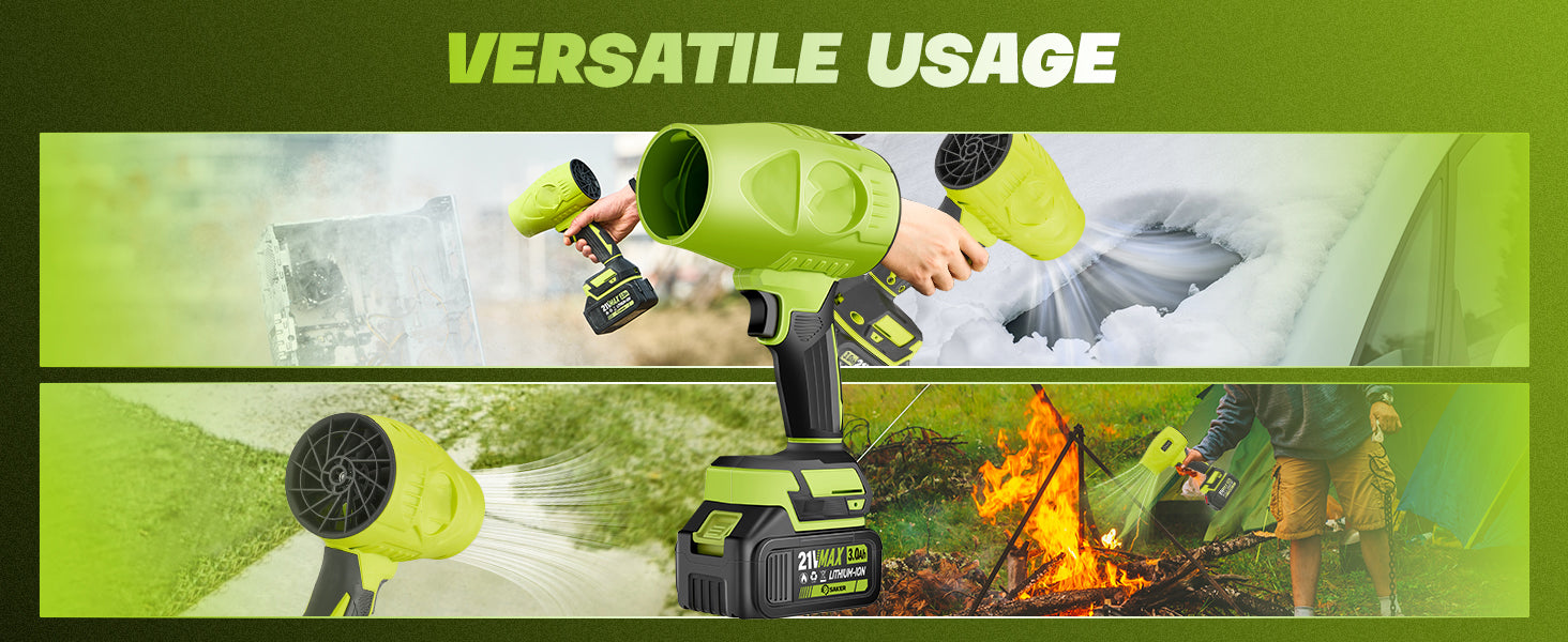 21V*2 Pcs Batteries: The Leaf Blower Cordless is equipped with two large capacity lithium batteries of 21V * 2 Pcs, so even when used outdoors, there is no need to worry about running out of power. To maximize battery life and longevity, please fully charge the battery when not in use.
