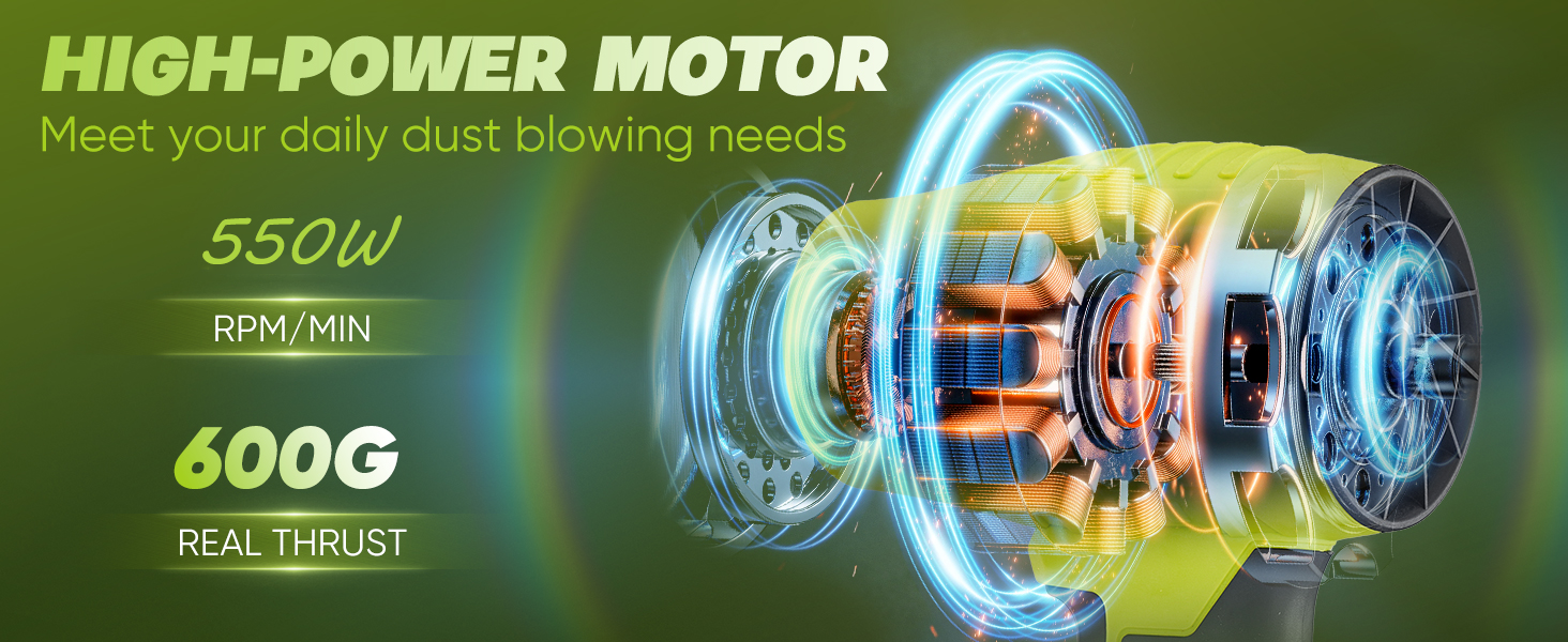 Advanced Motor: Cordless Leaf Blower adopts advanced turbo technology to maximize airflow output. Up to 28000RPM, the portable dust cleaner boasts a blowing power of 600G. This enables you to tackle tasks quickly and efficiently. It easily clears outdoor debris like fallen leaves and even snow, saving you time and effort.