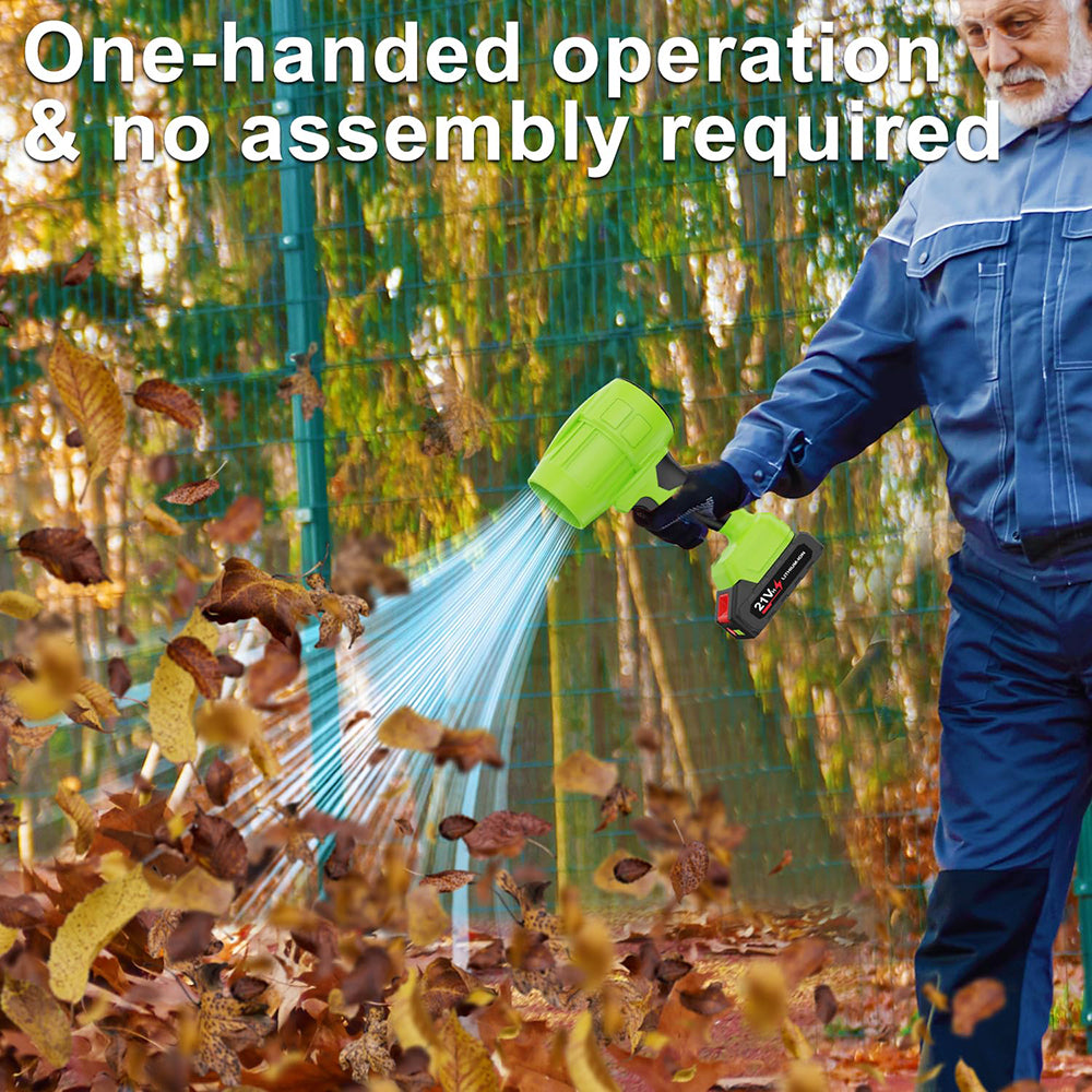 21V*2 Pcs Batteries: The Leaf Blower Cordless is equipped with two large capacity lithium batteries of 21V * 2 Pcs, so even when used outdoors, there is no need to worry about running out of power. To maximize battery life and longevity, please fully charge the battery when not in use.